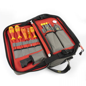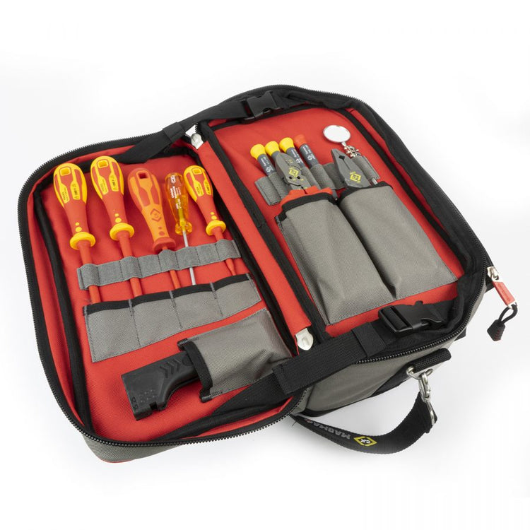All-in-one tool kit and test meter storage, featuring 27 pockets and 100% waterproof and crackproof polymer base.