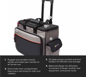 - Balanced design for effortless movement of larger toolkits, test equipment and power tools.