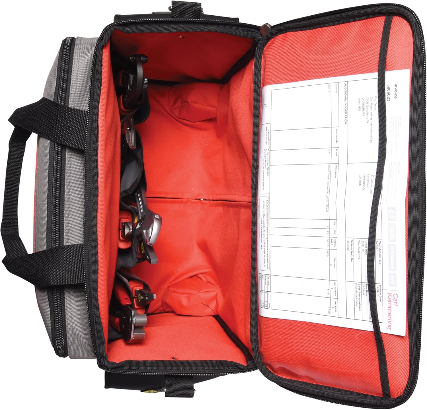 - Extra wide main compartment featuring a red lining for high tool visibility.