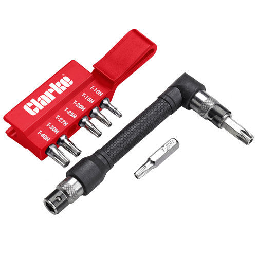 7 popular TX bits (compatible with TORX®) together with a neat magnetic angle head driver, all retained in a handy waist belt clip and particularly useful for automotive and security fixings.