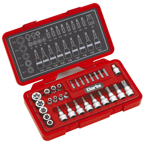 Clarke's PRO162 set contains 29 Chrome Vanadium Steel **Torx-Star & security bit sockets, each with a 3/8" or ¼" square drive for any equivalent square drive ratchet. The full set contains many of the most commonly needed sizes of tamper-proof fastener sockets & Torx Star driver bits.