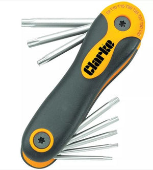 Clarke's 'Pro' use security torx key tool set has eight chrome vanadium steel blades, all of which conveniently fold into the ergonomically shaped handle.