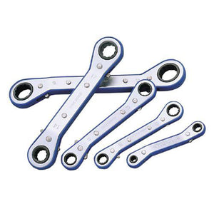 A useful set of five angled head, reversible ratchets manufactured from chrome vanadium steel with hardened sockets.