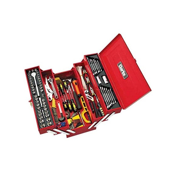 All Steel Cantilever tool box complete with tools. Cantilever design is ideal for easy access and organisation of tools. Features 5 compartments.
