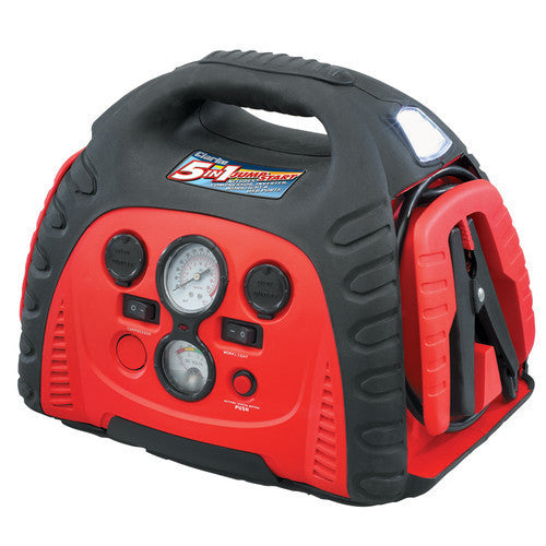 The JS5IN1 has a powerful jump start facility, a built-in compressor for inflating car/bike tyres, air beds etc, a 300W inverter power supply, 2 x 12V DC power supplies, 2 x USB 5V DC power supplies and a 7 LED work light.