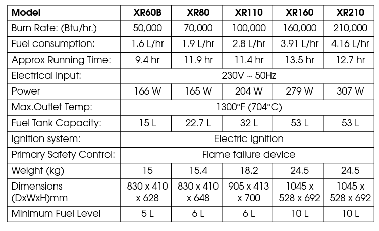 - Stainless Steel combustion chamber. High efficiency air & fuel filters. Automatic flame failure cut-out.
