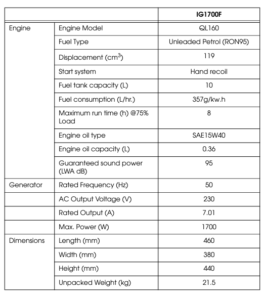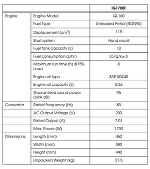 Product manual of Clarke IG1700F 1.7kVA open frame inverter petrol generator