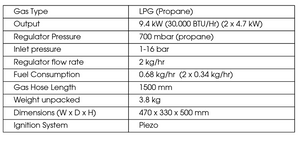 - 9.4kW (30,000 BTU) total heat output (4.7kW per head)