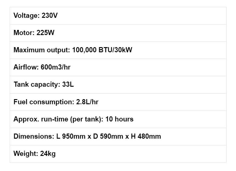 - The 33L tank offers great fuel economy, able to heat large spaces quickly and evenly for approximately 10 hours.