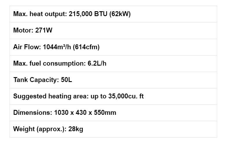 - The clean burning unit operates on kerosene, diesel and paraffin delivering an impressive 215,000 BTU/hr.