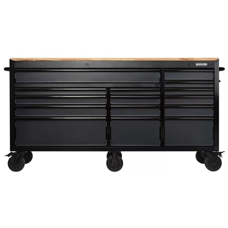 The Draper 08241 BUNKER® workbench roller tool cabinet combines superior performance with modern style. This roller cabinet features 15 drawers and a sleek black anodised aluminium trim, complemented by a highly durable matt grey powder finish. The hardwood worktop, measuring 25mm thick, offers ample space for daily tasks. With a steel handle and four castor wheels, this cabinet can be easily moved and transported, and the brakes on two of the wheels keep it secure while stationary. The unit also includes an integral lock and two keys for added security. Transform your workspace today by visiting your trusted online BUNKER® stockist.