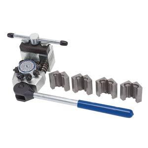 Expert Quality, for SAE convex, SAE double and DIN convex flaring on brake pipes. SAE Convex – 3/16”, 1/4”, 5/16”, 3/8” and 8mm. SAE Double – 3/16”, 1/4”, 5/16”, 3/8”, 4.75mm and 8mm. DIN Convex – 4.75mm and 8mm. Mounts in a bench vice for secure accurate use. Rotating turret selector for ease of use when choosing the relevant punch in creating flares. Supplied with four interchangeable split die sets for rapid set up. Display packed in blow mould case.