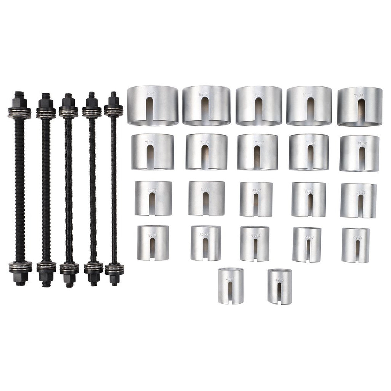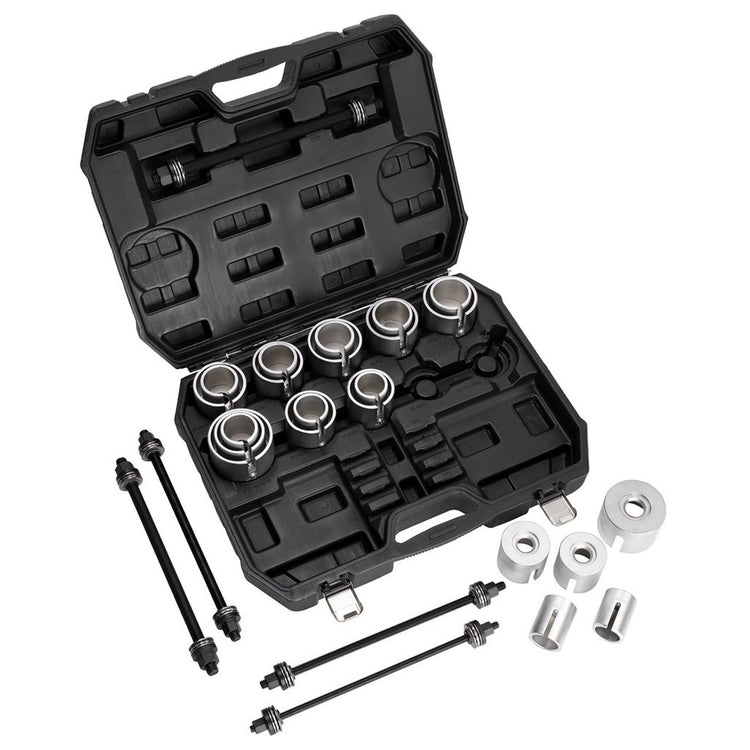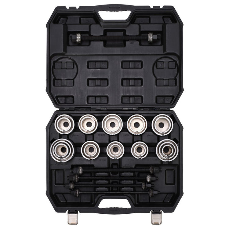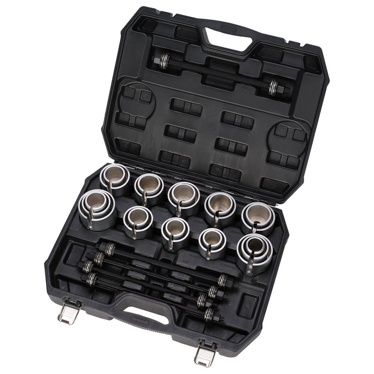 Expert Quality, for the accurate and controlled insertion/removal of normal bearings, silent bearings, hydraulic bearings, rubber bearings, bearing bushes, shaft seals etc. Comprises 22 adaptor rings and five fine thread puller bars with thrust bearing hex. nut ends. Packed in blow mould carrying case and display sleeve.