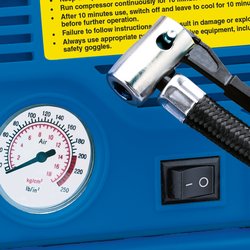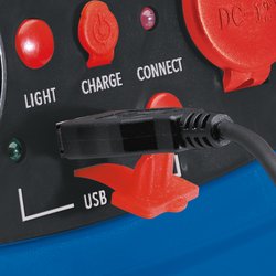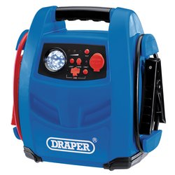 12V portable and versatile jump starter. Fitted with LED battery charge indicators, 12V output socket, USB output socket, LED work light, polarity inversion and 150 PSI air compressor with pressure gauge. 1m (approx.) cables with insulated clamps. Supplied with 3 inflation nozzles, 230V mains charger and 12V DC charger.