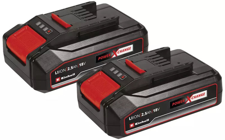 The 2x 18V 2.5 Ah Power X-Change batteries are members of the multifunctional and completely interchangeable Power X-Change rechargeable battery system from Einhell. The Power X-Change rechargeable batteries can be used universally for supplying power and endurance to every cordless tool from the entire garden and workshop product family. The advantages to the customer are obvious: A single rechargeable battery and a single charger for all tools not only saves significant costs of buying, universal use helps protect the environment and provides flexibility in the home and garden too. It also eliminates the untidiness and chaos of having different rechargeable batteries and chargers for each separate tool. The 18 V 2.5 Ah PXC is a basic rechargeable battery from the Power X-Change family and is also suitable for TWIN-PACK use for 36 V applications. With two 2.5 Ah batteries as TWIN-PACK the working time will be prolonged and the batteries can provide more power (2x 18V = 36V) for power demanding applications. The ABS process-controlled active battery management system has a microprocessor for permanently monitoring the battery parameters. It therefore ensures maximum safety, optimum tool performance, maximum operating time and a maximum service life. The current charge level can be checked on a 3-step LED display. The housing is designed to be resistant to dust, corrosion and mechanical influences. There is a trough handle to enable it to be removed from each tool with ease.