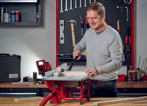 The TC-TS 200 bench-type circular saw comes with a parallel stop with double clamping and two stop heights. The cable can be safely and conveniently stowed on the integrated cable holder. The carbide blade always delivers clean, powerful cuts. A push stick is required for safety reasons and has its own holder where it is always within reaching distance.