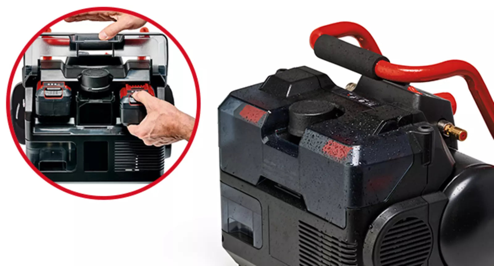 This is thanks to the powerful yet portable cordless compressor, with its 6-litre tank, max. 8 bar operating pressure and intake capacity of 150 litres per minute. It is powered by Twin-Pack technology, which uses a pair of 18 V Power X-Change batteries. The battery compartment can be sealed to protect the two batteries against splashes of water and dust.