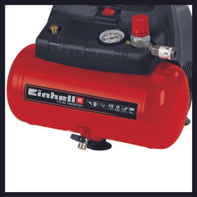The 6 liter tank enables small jobs to be performed without the motor starting up again. This air compressor works without lubrication and is therefore not only oil-free but also low in maintenance and easy to transport at any angle. With pressure regulation by a pressure reducer the TC-AC 190/6/8 OF compressor can be variably regulated from 0 to 8 bar for numerous applications.