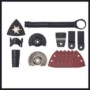 A tool chuck with 12 adjustable settings enables flexible operation. A comfortable soft grip makes it safe and pleasant to work with. Also included is a dust extraction device for fitting without any additional tools, plus a convenient dust extraction adapter. A plunge-cut saw blade for wood and plastic, an additional BIM plunge-cut saw blade for metal, a segment saw blade for wood, plastic and soft metal (HSS), and a diamond segment saw blade for tile joints are all part of the package. A triangular grinding/sanding plate, six sheets of abrasive paper (3*P60/3*P120) and a scraper complete the delivery.