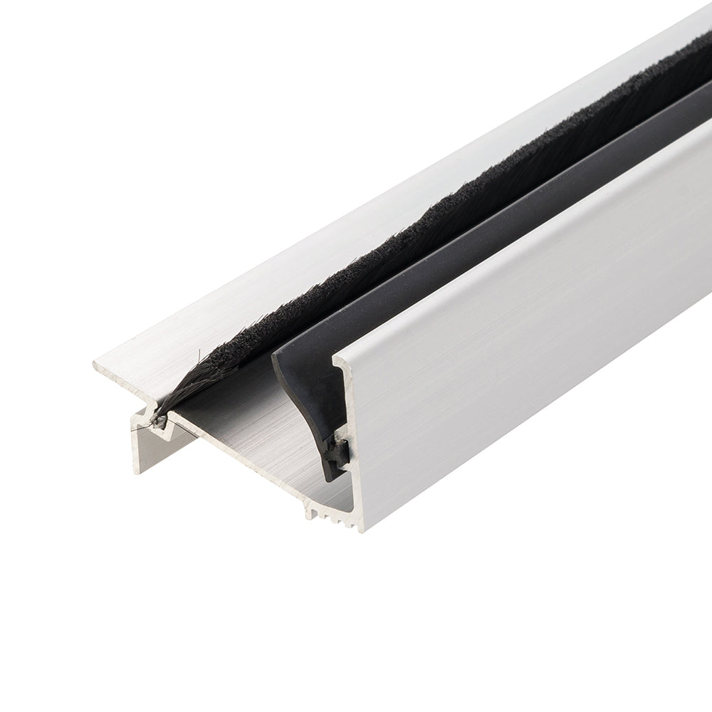 Aluminium. Improves insulation and keeps out pests, draughts and noise. Reduces water ingress. Compatible with doors with 10-15mm clearance. Attaches to bottom of door. Length 914mm. Width 52mm.