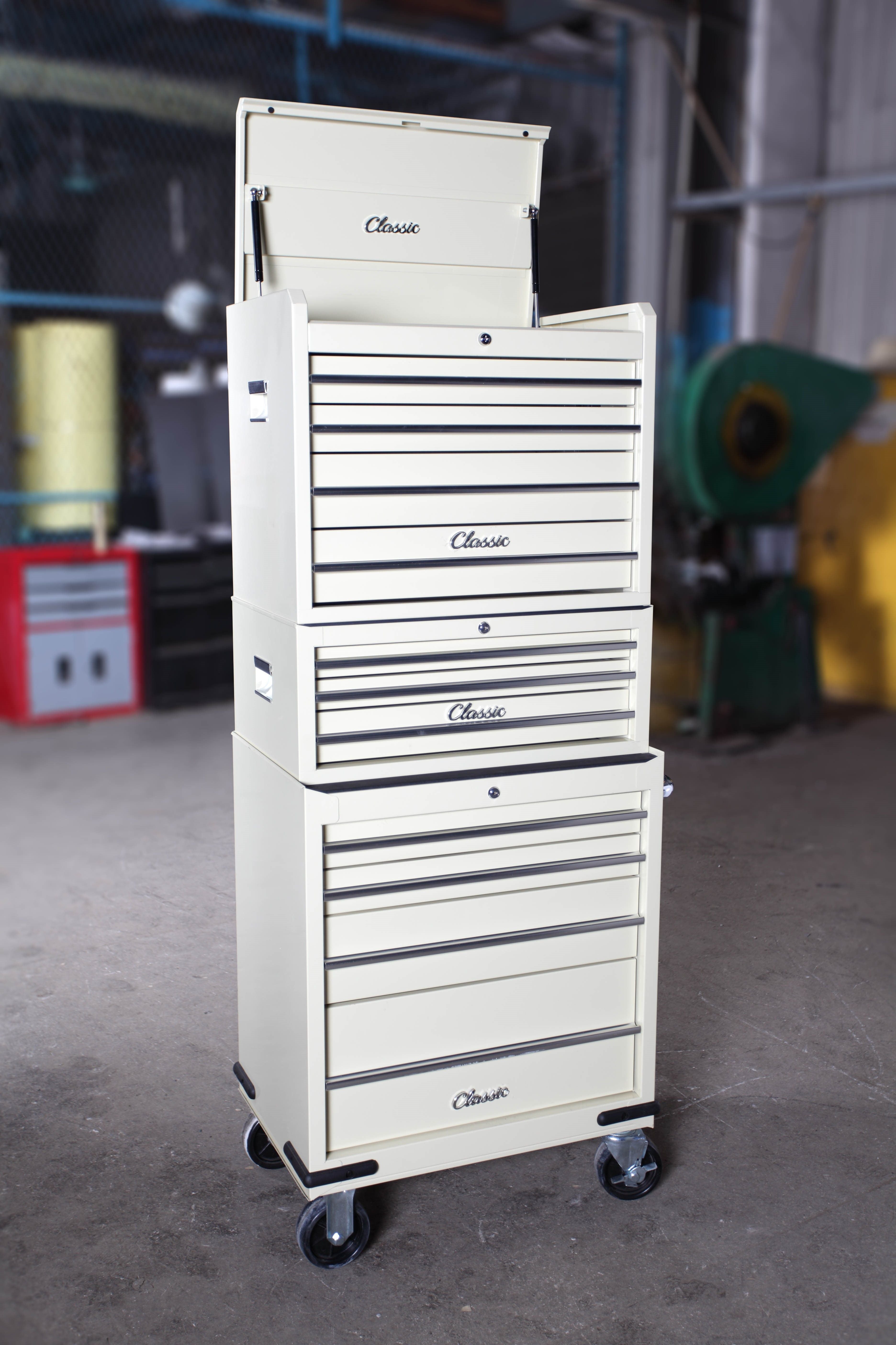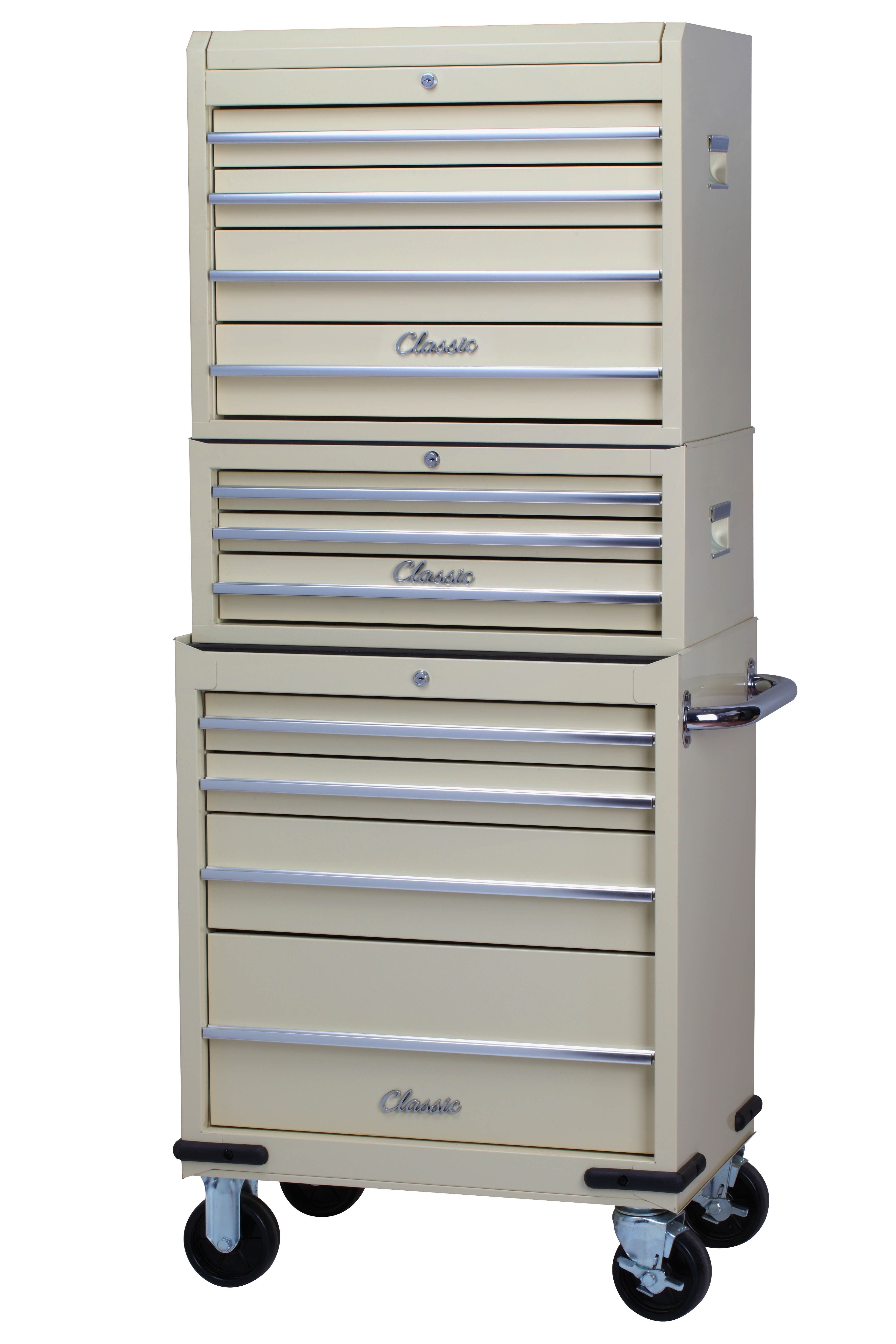 The Hilka CL11CU Classic 11 Drawer Combination Unit is a comprehensive storage solution designed for classic car owners and enthusiasts. This impressive 26" unit combines style with functionality, featuring an 11-drawer configuration comprising a 4-drawer chest, 3-drawer add-on, and 4-drawer trolley base. Built for durability and ease of use, the unit includes gas struts for smooth lid operation, a lift latch mechanism, and 5" locking castors for secure mobility. Drawer slides feature full ball bearing construction with positive stops, ensuring smooth and reliable access to your tools. The spacious design accommodates extensive tool collections with protective 2mm drawer liners and a robust 10mm top mat. Chrome-plated side handles and full-length aluminium drawer pulls add a classic aesthetic while providing comfortable grip points. Measuring 676 x 461 x 1687mm, this combination unit offers substantial storage capacity whilst maintaining the timeless appeal that complements any workshop or garage. An ideal choice for organizing and securing your complete tool collection.