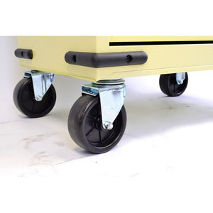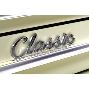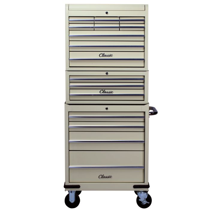 The Hilka CL16CU Classic 16 Drawer Combination Unit brings timeless style to any workshop or garage. This 26" combination system features a traditional design that appeals to classic car owners and enthusiasts alike. The unit comprises a 9-drawer chest, 3-drawer add-on, and 4-drawer trolley for flexible storage and mobility. Gas struts and lift latches ensure smooth, controlled operation, while 5" locking castors keep the trolley secure. Lockable ball bearing drawer slides glide effortlessly for reliable access to your tools. Built for capacity, the large frame holds extensive tool collections. Each drawer is lined with 2mm protective material, and the top features a durable 10mm mat. Chrome-plated side handles and full-length aluminium drawer pulls with positive stops combine functionality with classic aesthetics. Dimensions: 676 x 461 x 1687mm. A comprehensive storage solution designed for organisation and durability.