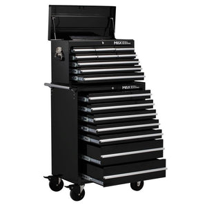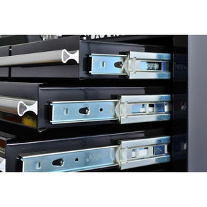 Hilka PTC16 Professional 16 Drawer Combination Tool Chest Heavy duty all steel construction built to withstand demanding workshop environments. Features ball bearing slides with positive stop for smooth, reliable drawer operation. The reinforced cabinet base supports 5" casters, allowing easy mobility across your workspace. Comprehensive storage with 9 drawer tool chest combined with 7 drawer extra high rollaway cabinet — 16 drawers total for organised tool management. Keyed locking mechanism secures your tools, while full length aluminium drawer pulls and chrome side handles provide durability and easy access. Lockable casters keep the unit stationary when needed. Includes protective top mat and drawer liners to protect your tools and work surface. Overall dimensions: 676mm wide × 461mm deep × 1378mm high (including castors). Professional grade storage solution for serious tradespeople and workshop professionals.
