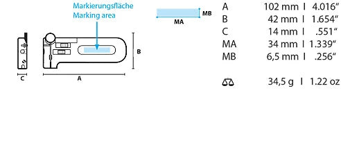 - Dimensions (LxBxH in cm): 10,2 x 4,2 x 1,4