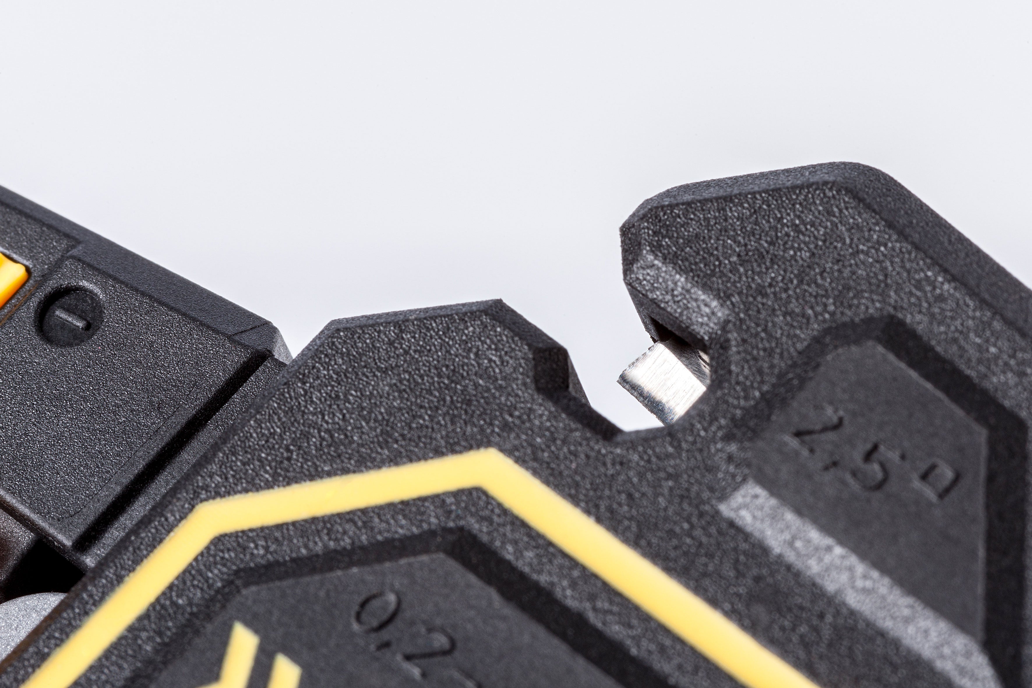 - Integrated cutting depth adjustment for different conductor insulation materials,