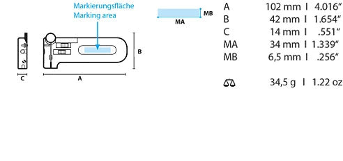 - Dimensions (LxBxH in cm): 10,2 x 4,2 x 1,4