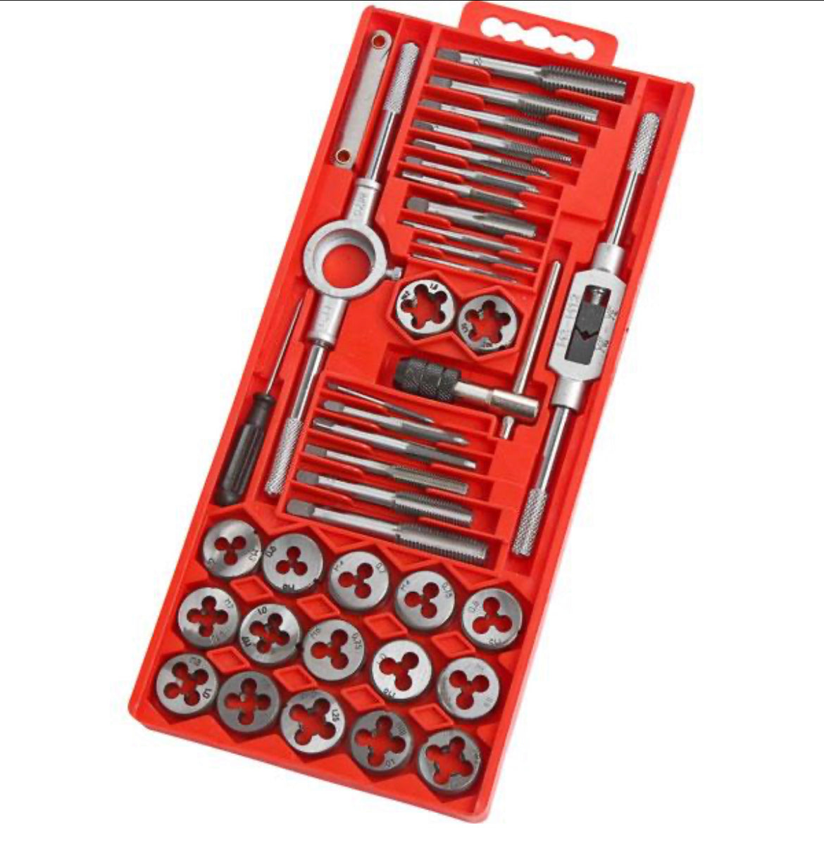 40pc Tap and Die Set Containing 1 Tap and Die in each of the following sizes 3 x 0.5 . 3 x 0.6 . 4 x 0.7 . 5 x 0.8 . 5 x 0.9 . 6 x 0.75 . 6 x 1.0 . 7 x 0.75 . 7 x 1.0 . 8 x 1.0 . 8 x 1.23 . 10 2 Adjustable Tap Wrenches T-Handle and Die Wrench Screwdriver Pitch Gauge