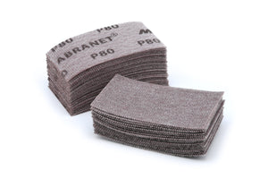 Abranet Strips 70x125mm. Abranet is a revolutionary new sanding material for dust-free sanding. This unique patented sanding material contains thousands of small holes, making it possible to effectively vacuum dust and other particles away without clogging the disc surface. The result is a very uniform sanding pattern and a perfectly smooth surface. Since the amount of airborne dust has been minimised, the work environment is remarkably improved. Abranet has been developed for sanding filler, primers, lacquers, composite materials and a large number of other materials. This is a durable long-lasting sanding material.