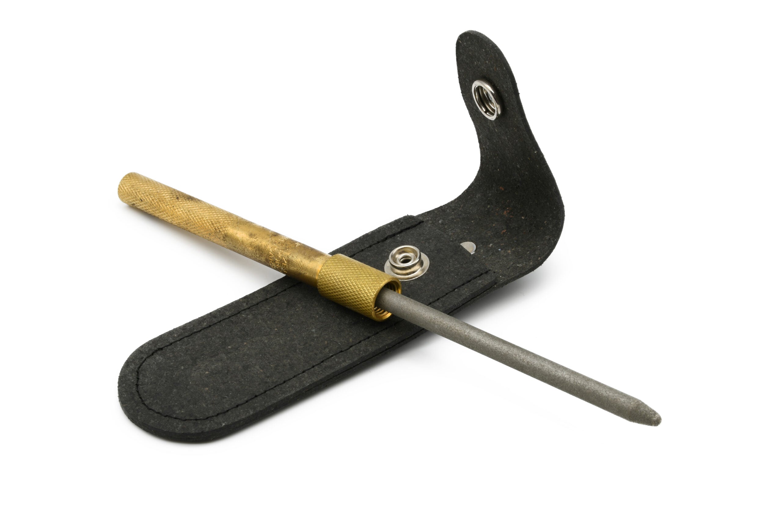 The EZE-LAP 'M' Type Shaft Hone has a high quality diamond surface on a shaft that measures 3 1/4" x 1/4". The handle can unscrew from the shaft and screw on to the opposite side of the hone for compact storage. This fits into the leather pouch which has a belt loop. The diamond surface is a Fine grit (600 grit).