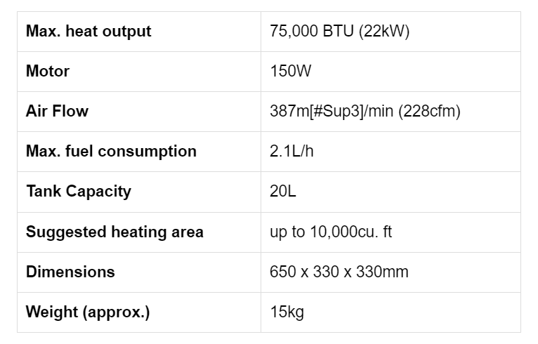 Producing an impressive 75,000 Btu/hr, the 20ltr fuel tank gives approximately 10hrs continuous running time, making the unit extremely fuel efficient and economical.