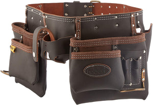 10 Pocket Professional Double Oil Tanned Leather Tool Pouch Two large main pockets, two medium-size flared pockets, six small tool pockets, two metal hammer holder, one scaffolding spanner holder, one leather tape pocket, rivet reinforced for added strength, 50mm leather belt with steel buckle.