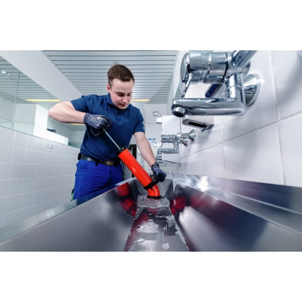 Optimal entry-level tool for installers, janitors and drain cleaners for the quick removal of simple blockages in connecting pipes of washbasins and sinks, tubs and toilets using the suction/pressure principle.