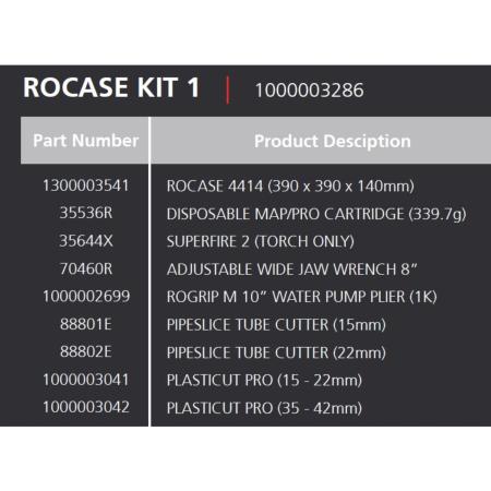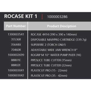 The Rothenberger Rocase Kit is a professional kit ideal for plumbers and traders, it comes with the Rothenberger Superfire 2 torch, a disposable canister of MAPP gas, a Rogrip M 10" plier, a wide jaw wrench, a pair of 15 and 22mm Pipeslice tube cutters and two Plasticut Pro cutters.
