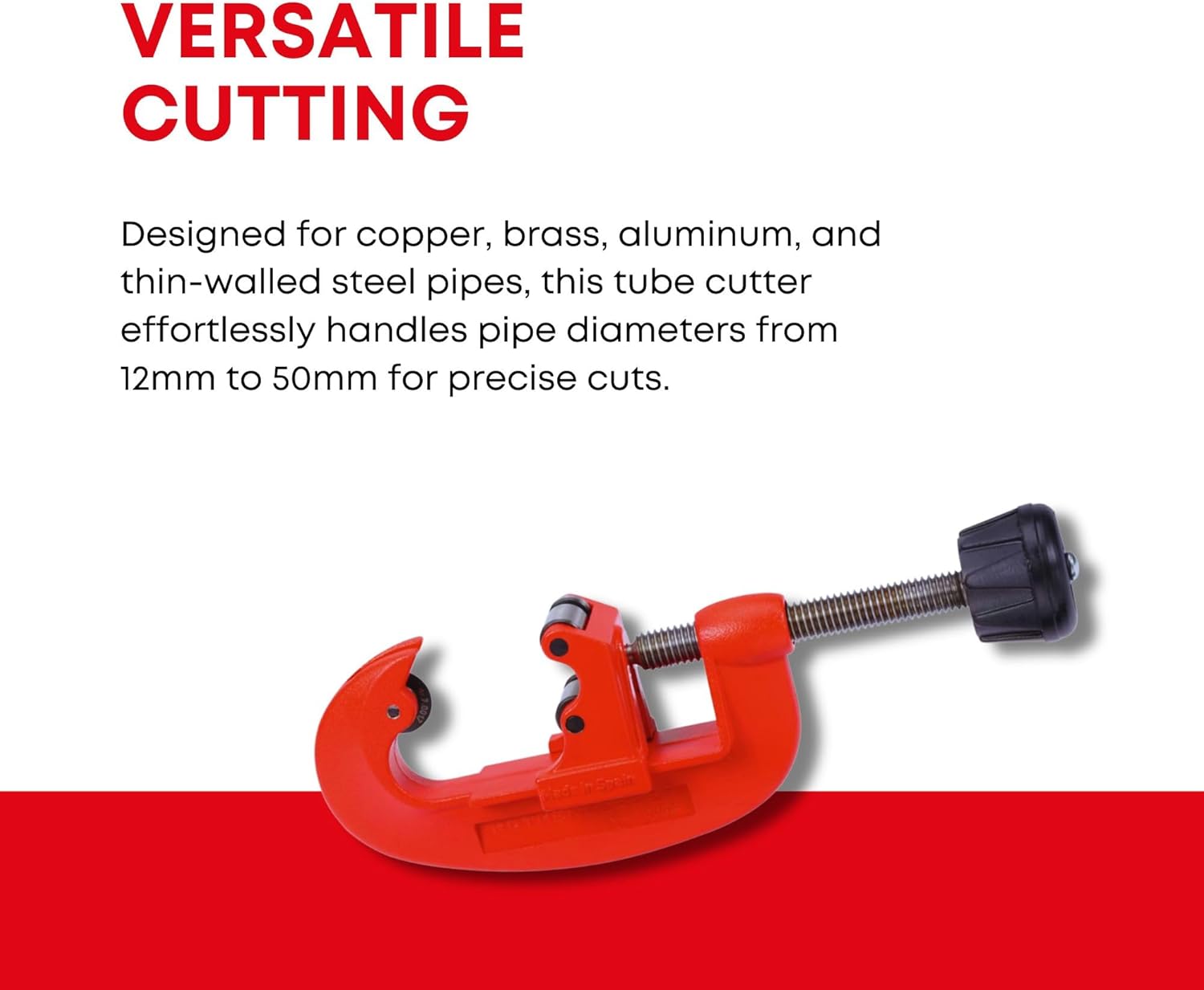 Manual pipe cutter for cutting copper, brass, aluminum and thin-walled steel pipes with Ø 12-50 mm diameter.