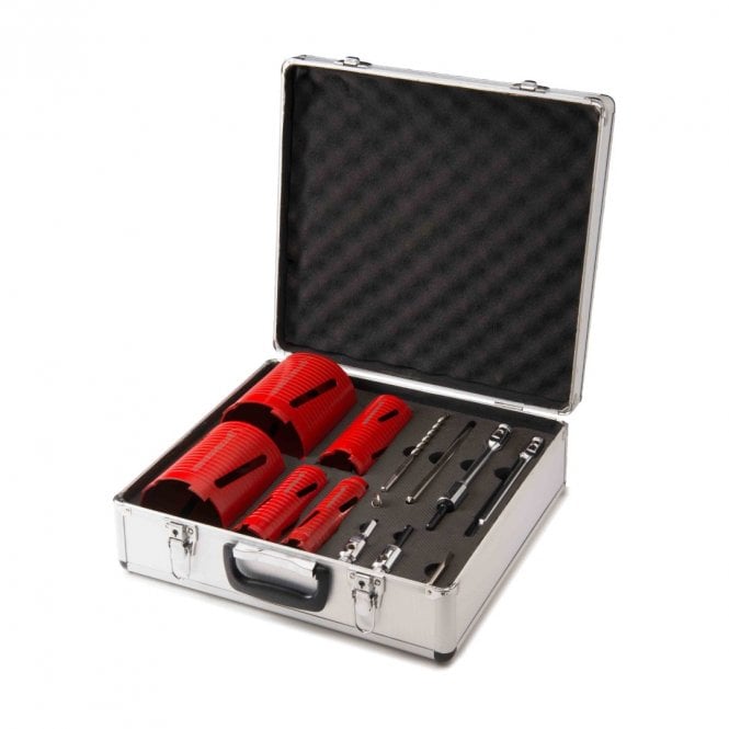This set features a universal 1/2" BSP connection, compatible with various dry core accessories, providing flexibility for different tasks. It includes the most commonly used sizes for plumbing and building applications, such as boiler flues, soil pipes, bathroom waste pipes, and tumble dryer vent kits.
