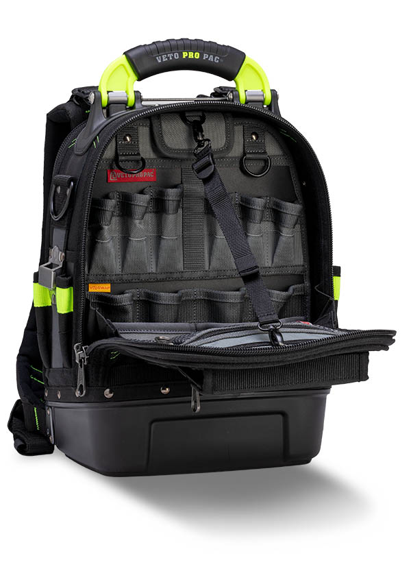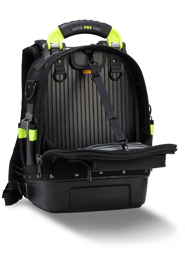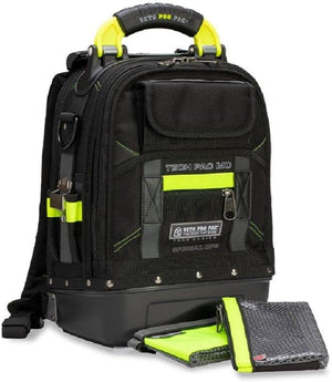 The NEW VERSION of the TECH PAC MC SPECIAL OPS is a compact backpack in black with Hi-Viz yellow accents, designed for techs who need to carry a minimum amount of tools and test meters hands-free for service calls and minor installs.