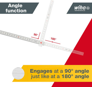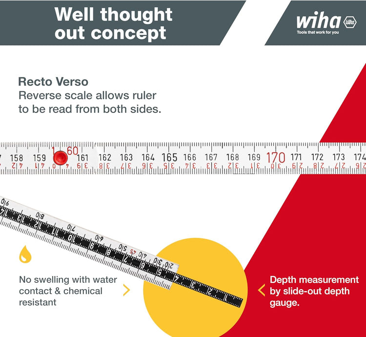 Depth measurement with push-out depth gauge. Angle measurement with anchoring of depth gauge in fixation hole. Scale running backwards (recto and verso) enables reading from both sides.