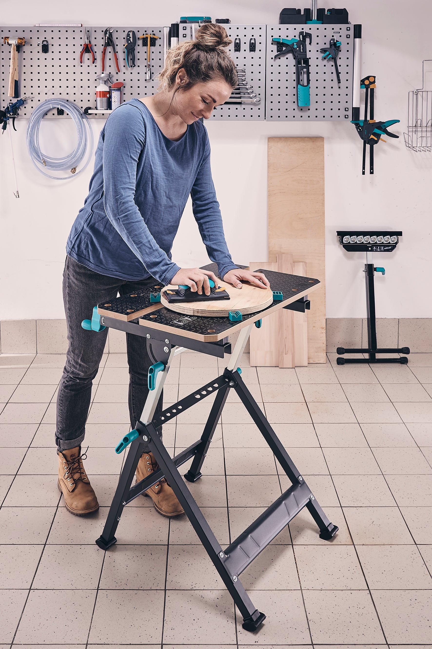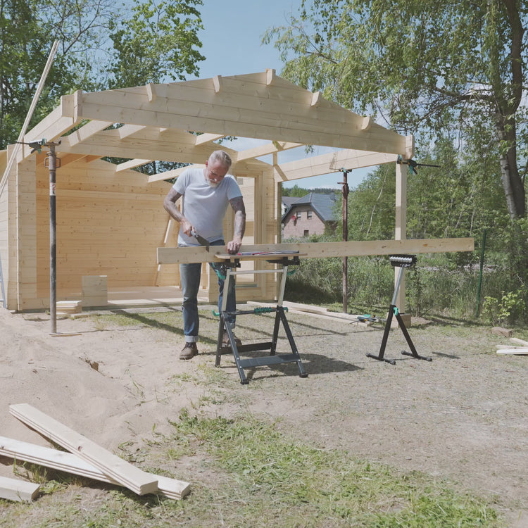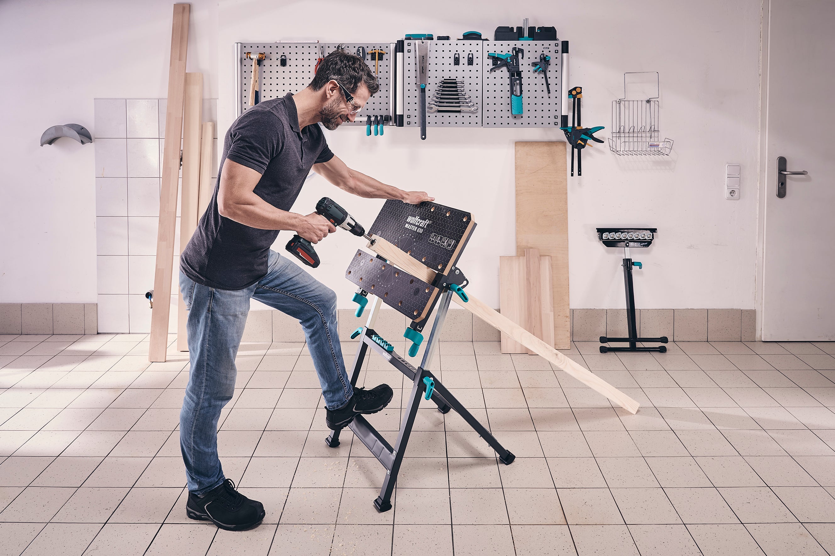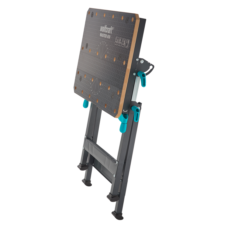 With four plastic clamping jaws and two pipe clamps, the MASTER 650 ERGO securely holds various workpieces. The clamping width ranges from 110 mm between the tabletop boards to 410 mm between the plastic jaws. At its highest position, you can also clamp workpieces up to 80 mm wide vertically. The included extension plate easily expands the FSC-certified MDF tabletop (with chamfered edges) to a generous 650 x 490 mm, accommodating larger workpieces.