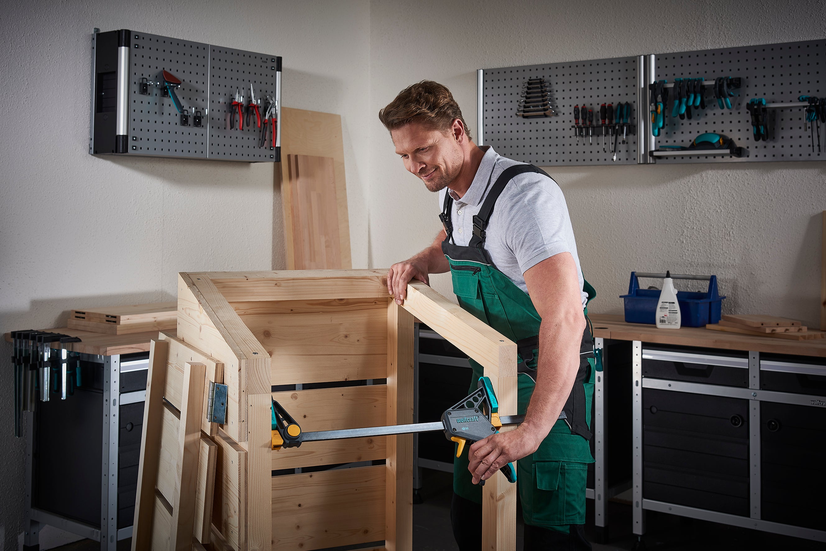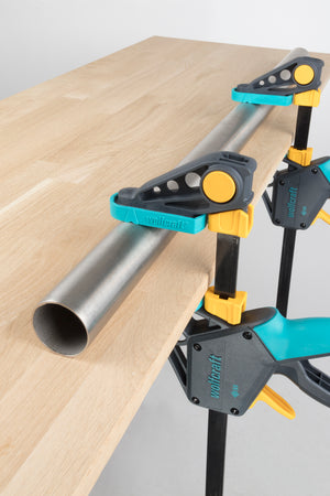 The PRO L One-Hand Clamp is your go-to tool for woodworking and furniture projects, designed for fast, secure fastening and holding of workpieces. Its innovative pump mechanism allows controlled, one-handed clamping and release, providing up to 120 kg of adjustable pressure. The ergonomic two-component handle, complete with a soft grip zone, ensures comfort and safety during extended use.
