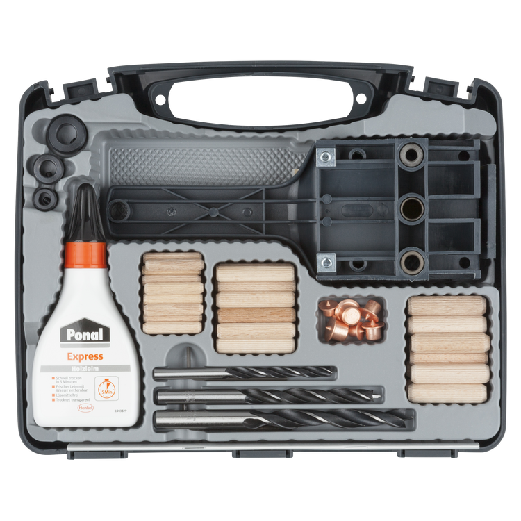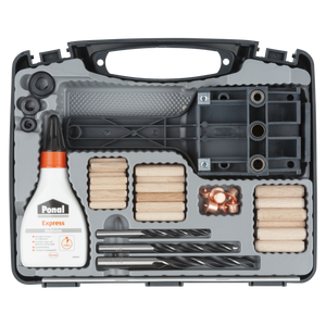 Alongside the dowelling jig, this set includes all the essentials for your project, from the correct wood drill bits to center points, depth stops, and wood glue—everything housed in a practical plastic case. Whether you’re embarking on furniture making or performing everyday repairs, this set equips you with all the tools you need for perfectly aligned, durable joints.